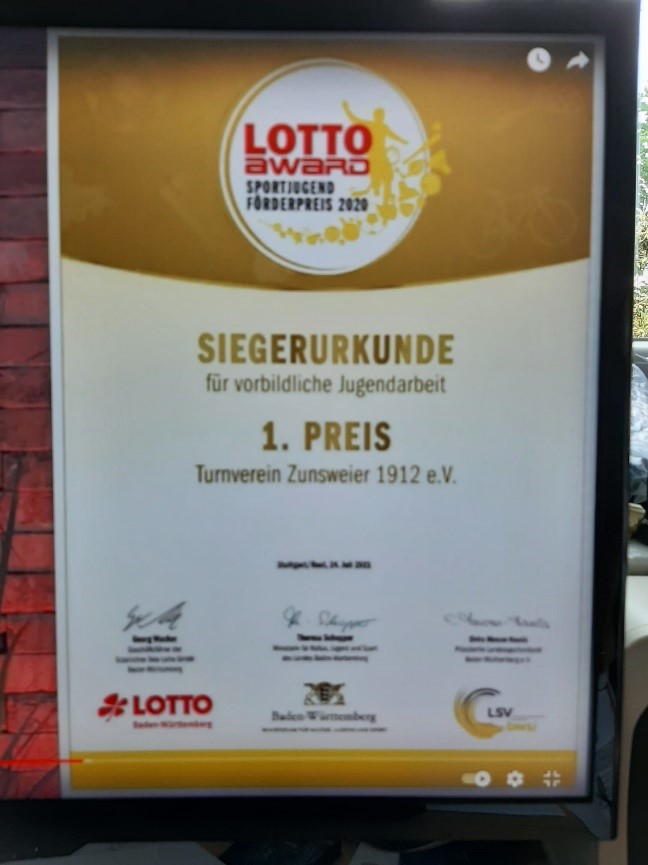 Diese Erfolgsgeschichte wurde als Bewerbung zum „Sport-Jugend-Förderpreis 2020“ eingereicht. Am Samstag, den 24. Juli war es dann soweit, die Preisträger wurden bekanntgegeben. Eigentlich sollte es eine tolle Show im Europapark werden, leider wurde diese abgesagt und so verfolgten wir die Preisverleihung nur online. Trotzdem war die Freude riesengroß als Christina Obergföll sehr überrascht darüber war, dass der 1. Preis in ihre direkte Nachbarschaft zum TV Zunsweier geht. Mit großem Jubel freuen wir uns über den „Lotto Award“ in der Region „Südlicher Oberrhein“, der mit einem Preisgeld von 2000€ verbunden ist.
